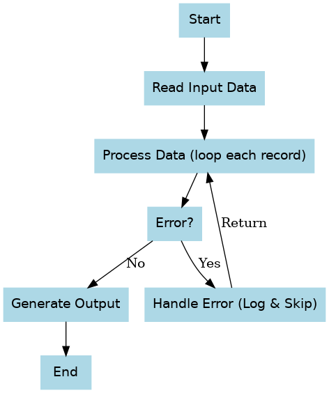 図: バッチ処理ジョブの基本的なフロー例(開始→入力取得→データ処理(繰り返し)→エラー発生時の処理→結果出力→終了)。このフローでは、まず入力データを読み込み、レコードごとに処理を行います。処理中にエラーが発生した場合はエラー内容をログに記録し、そのレコードをスキップして次のレコード処理に進みます(必要に応じて一定数以上のエラーで中断)。全レコードの処理が終わったら結果を出力し、正常終了となります。このようにエラー処理と通常処理の分岐を明確に設計しておくことで、想定外の事態にも対応しやすいバッチ処理となります。
